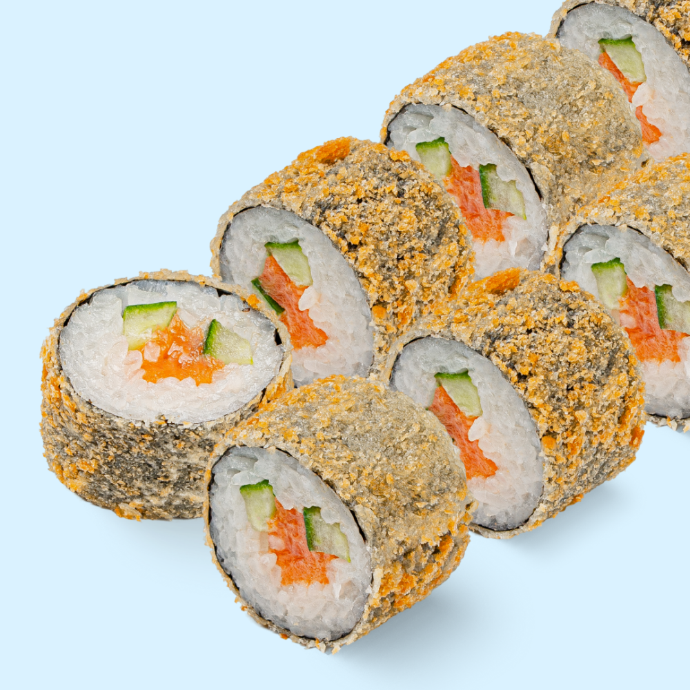 Рис, мицукан, сахар, комбу, соль, нори, лосось, лосось холодного копчения, огурец, мука, яйцо, сухари панировочные