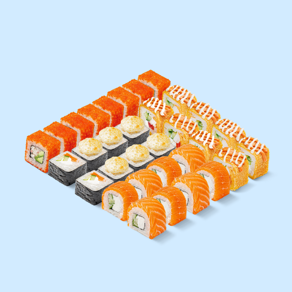 Бескомпромиссный набор роллов, который рвётся в твой рот. Открой пошире! Состав: Калифорния, Цезарь BIG, Запечённый с лососем, Филадельфия BIG