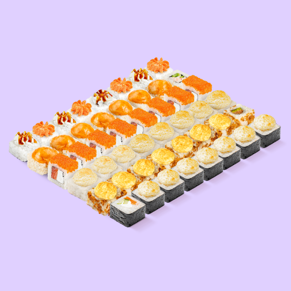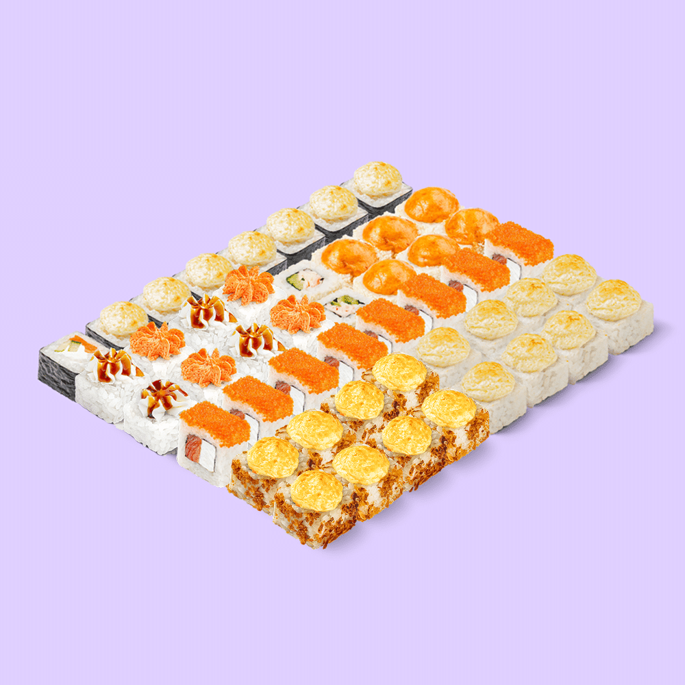 Чикуби — это жаркий взрыв запечённых вкусов для тех, кто любит погорячее! Состав: Запечённый с лососем, Запечённый с жареным лососем, Запечённый с курицей, Запечённый с крабом, Лосось с тобико оранж, Лава краб.