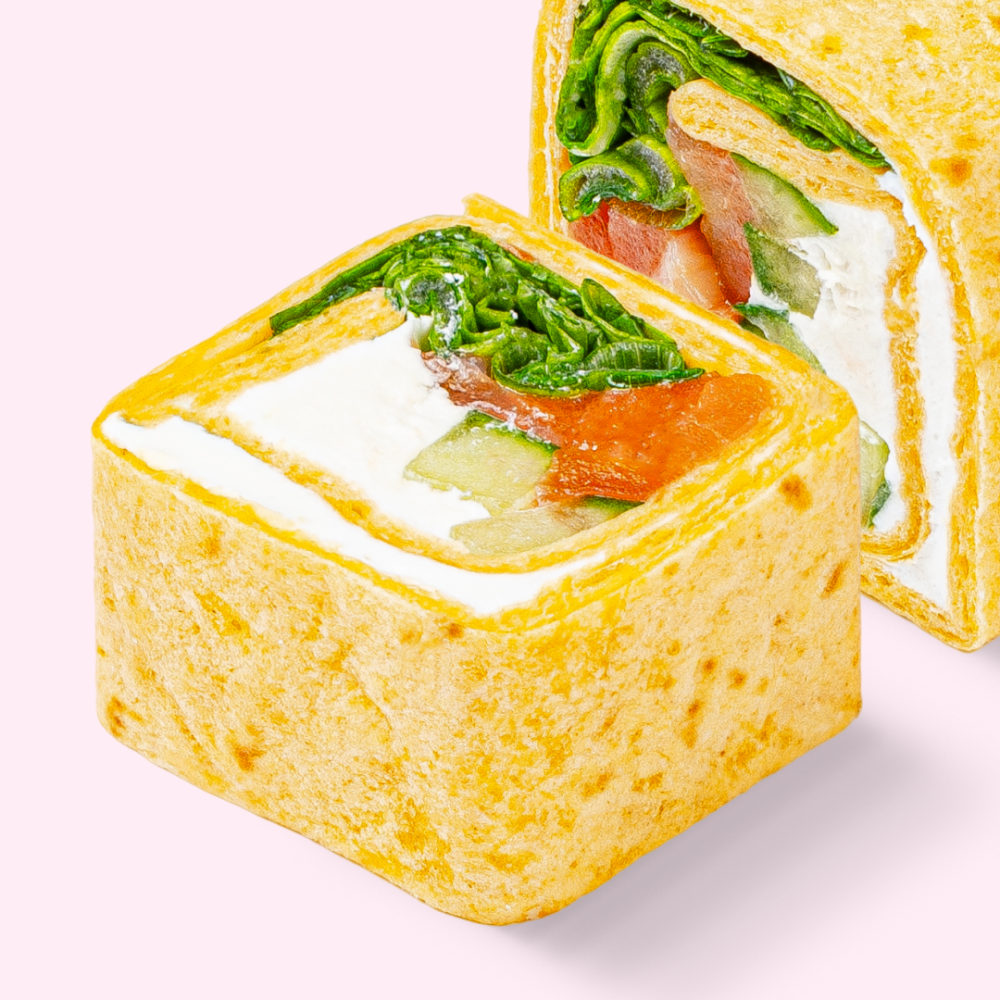 Тортилья, сыр сливочный, лук зеленый, огурец, лосось, соль, салат.