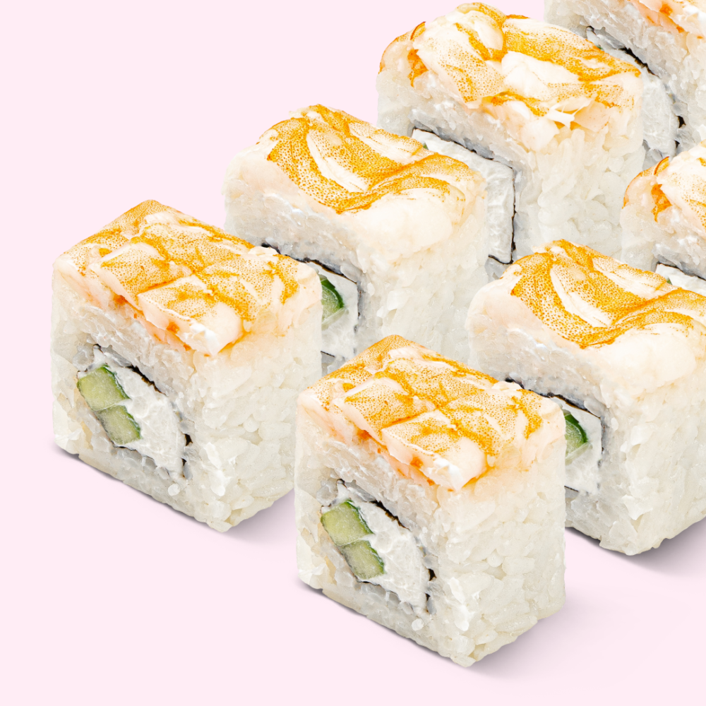 Рис, мицукан, сахар, комбу, соль, нори, креветка, сыр сливочный, огурец
