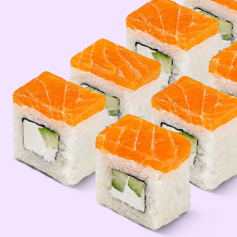 Рис, мицукан, сахар, комбу, соль, нори, огурец, лосось холодного копчения, сыр сливочный