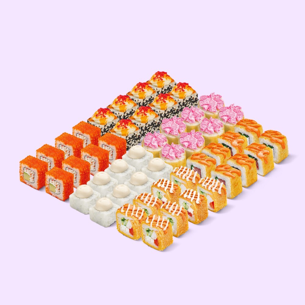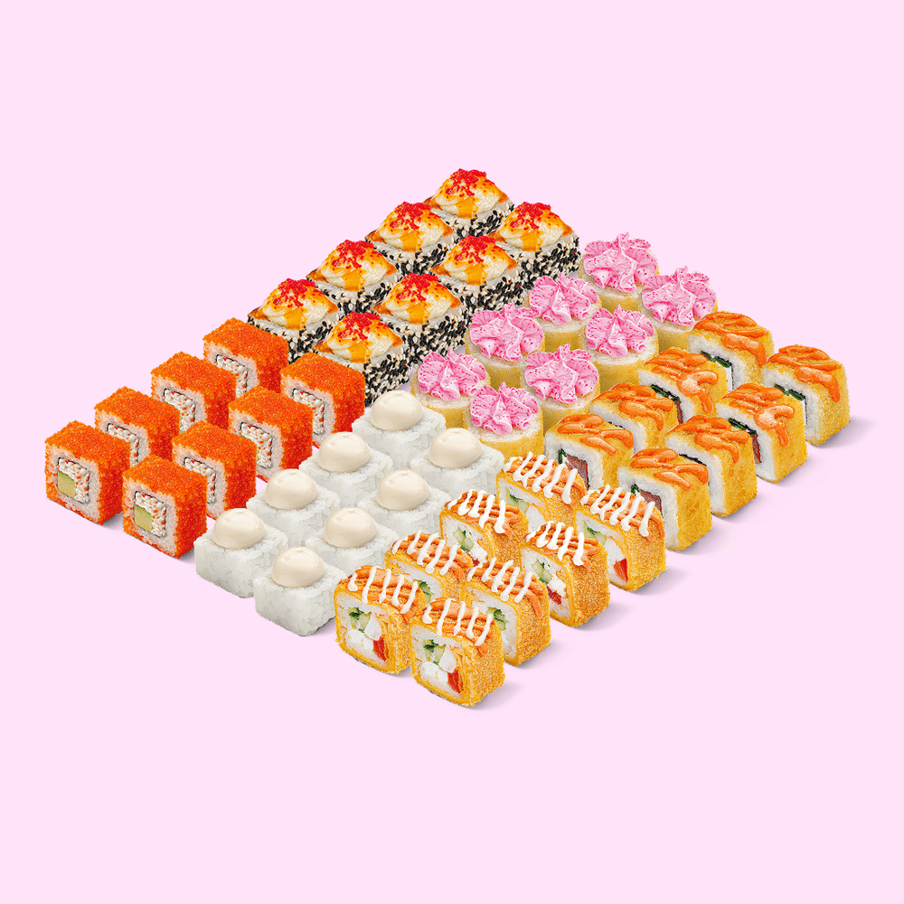 Ты ей: большой сет из 6 видов роллов с морепродуктами, рыбой и курицей. Она тебе: ой, спаси-и-ибки. Состав: Калифорния, Лава темпура, Спейшл NEW, Запечённая филадельфия с лососем и крабом, Цезарь BIG, Цезарь