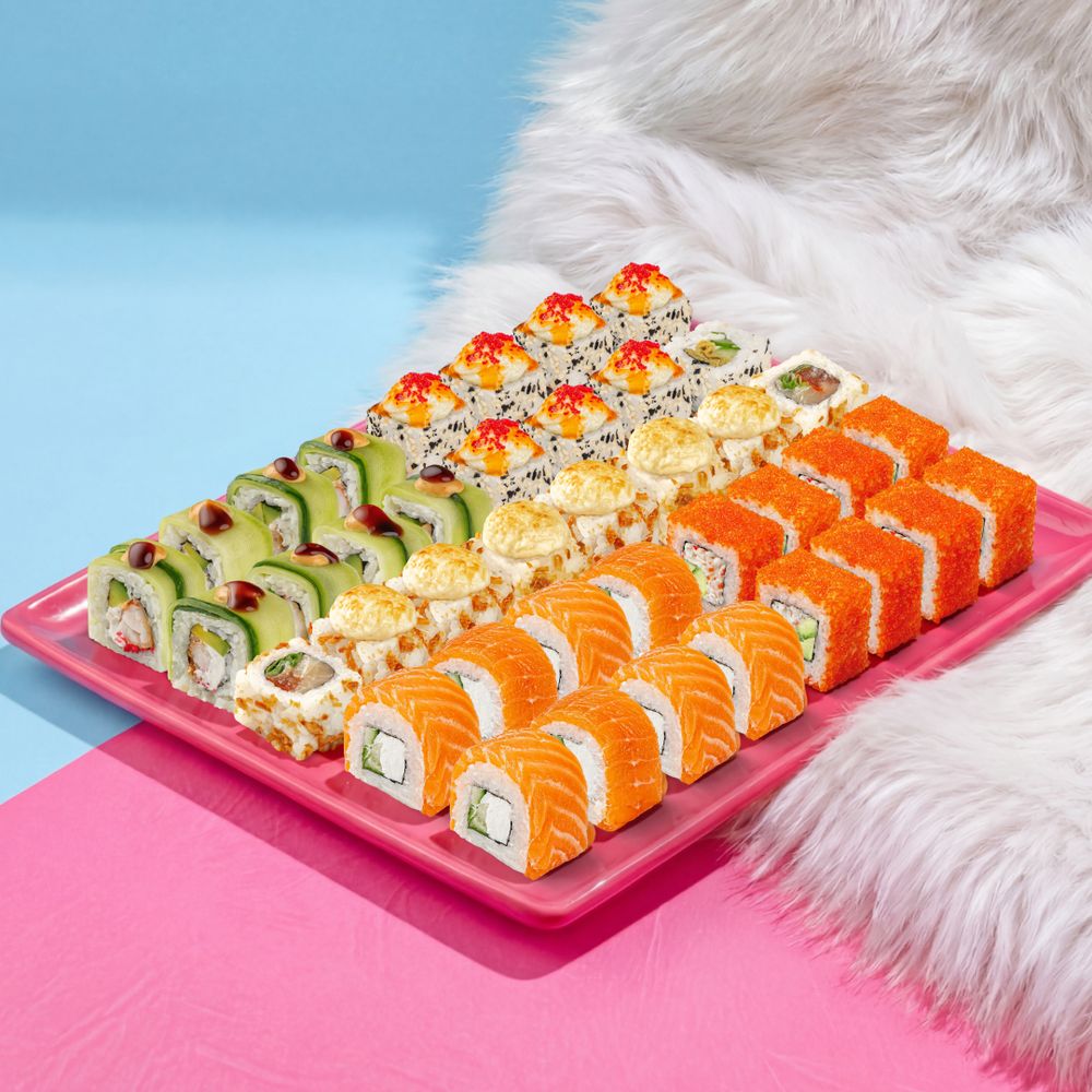 Едет в будни и по праздникам! Состав: Запеченный с жареным лососем, Запеченная филадельфия с лососем и крабом, Эби грин ролл, Филадельфия с огурцом, Калифорния с огурцом