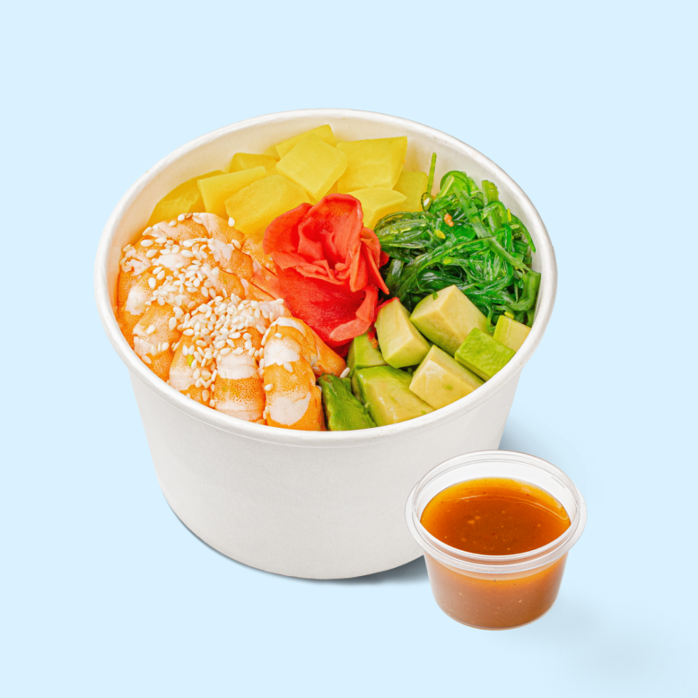 Рис, мицукан, сахар, комбу, соль, креветка, авокадо, чука, такуан, имбирь маринованный, тобико оранжевая, кунжут белый, соус свит-чили+том ям, соус лемограсс (отдельно).