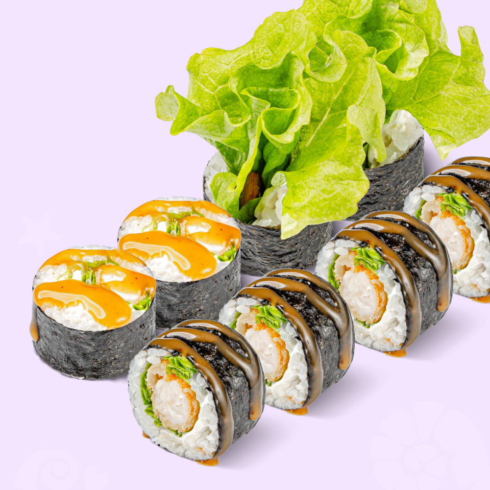 Креветка в кляре, рис, салат, соус лемонграсс, нори, сыр сливочный