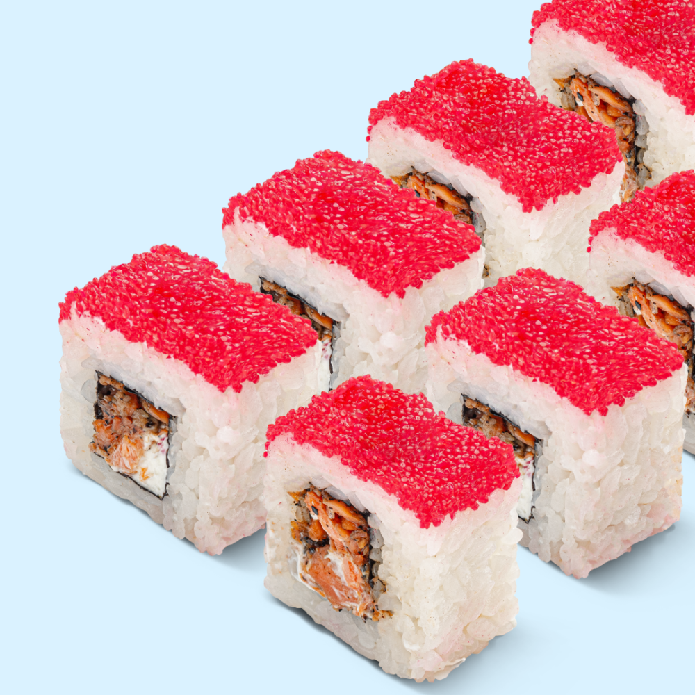 Лосось жареный, сыр сливочный, тобико, рис, нори