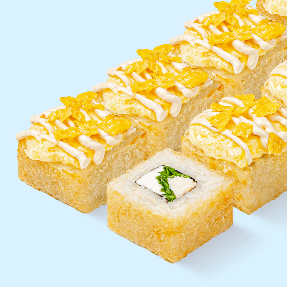 Рис, мицукан, сахар, соль, комбу,сыр сливочный, нори, филе куриное, приправа для курицы, салат, мука, яйцо, сухари панировочные, сыр гауда, майонез, начос, соевый соус, чеснок