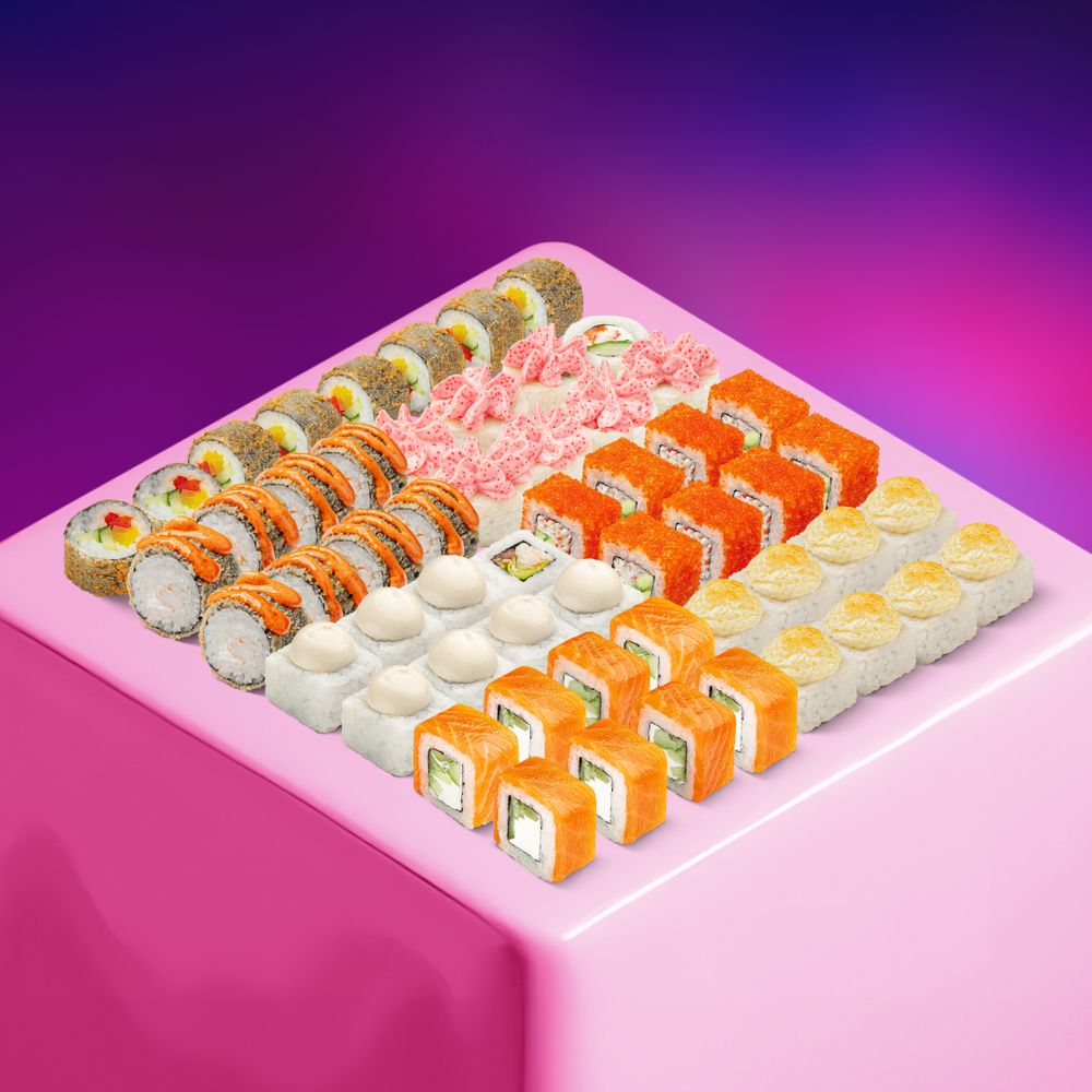 Идеальный набор роллов для твоей вечеринки по версии искусственного интеллекта. Тестируй с друзьями сет, придуманный нейросетью. Состав: Филадельфия с огурцом, Цезарь, Эби темпура, Калифорния, Лава сяке, Запечённый с курицей, Яссай Спайс.