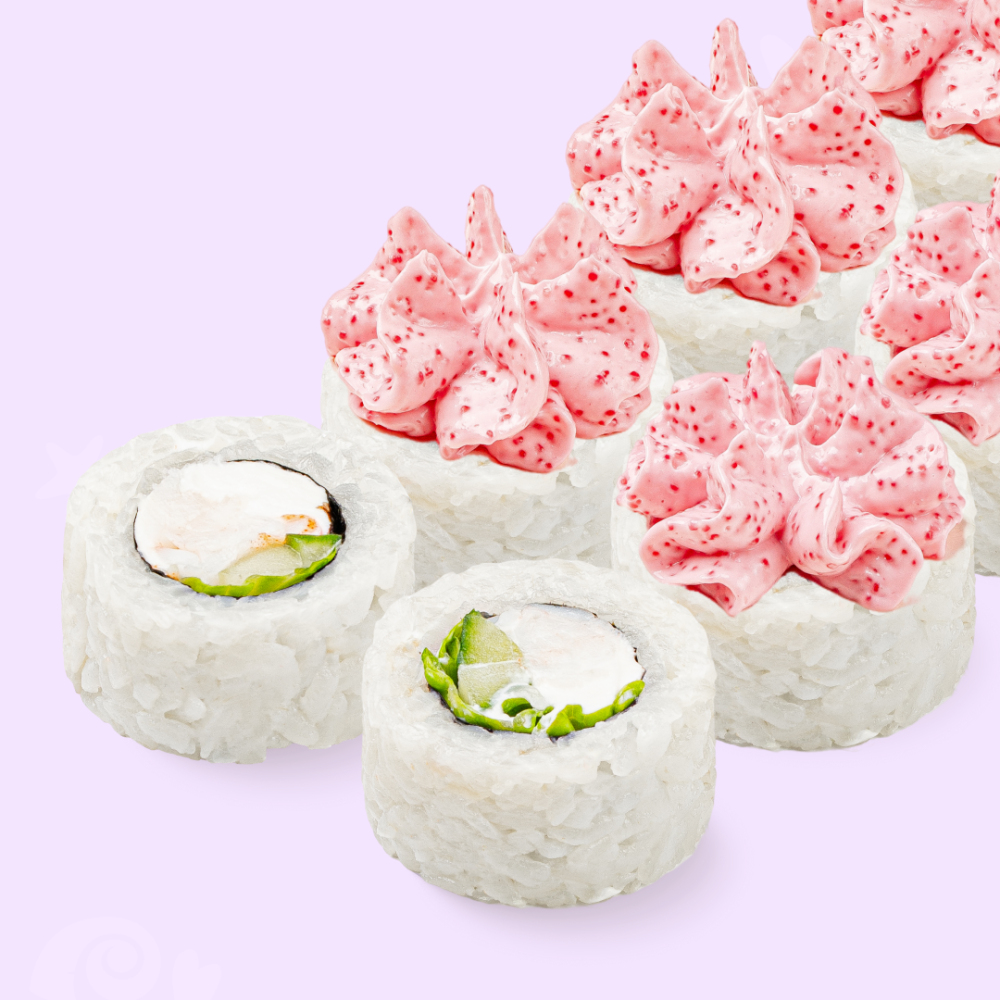 Рис, мицукан, сахар, комбу, соль, нори, кальмар, салат, огурец, сыр сливочный, тобико, майонез, креветка