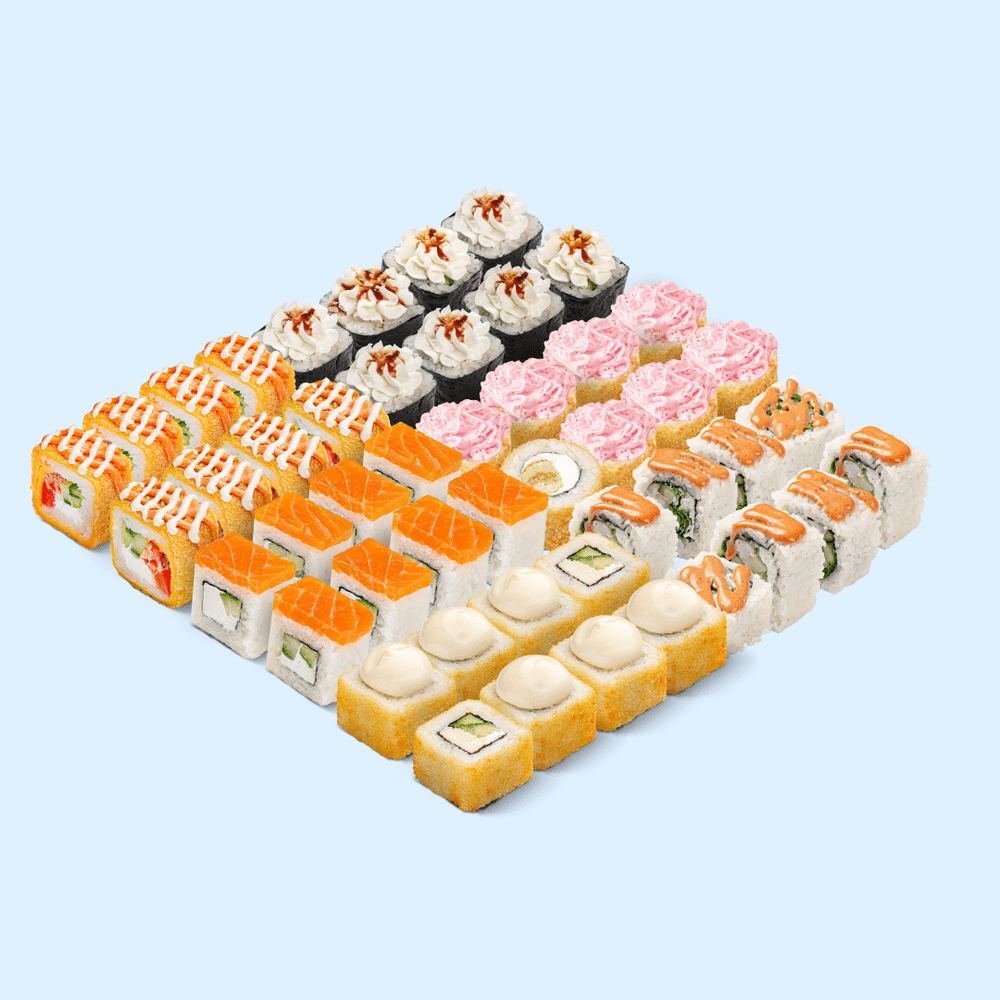 ЛЕГЕНДА ВОЗВРАЩАЕТСЯ! Куни Ли легендарный 6 видов роллов с начинкой из лосося, морепродуктов и курицы. В составе: Цезарь темпура, Лава темпура, Цезарь BIG, Филадельфия лайт, Краб терияки, Киото