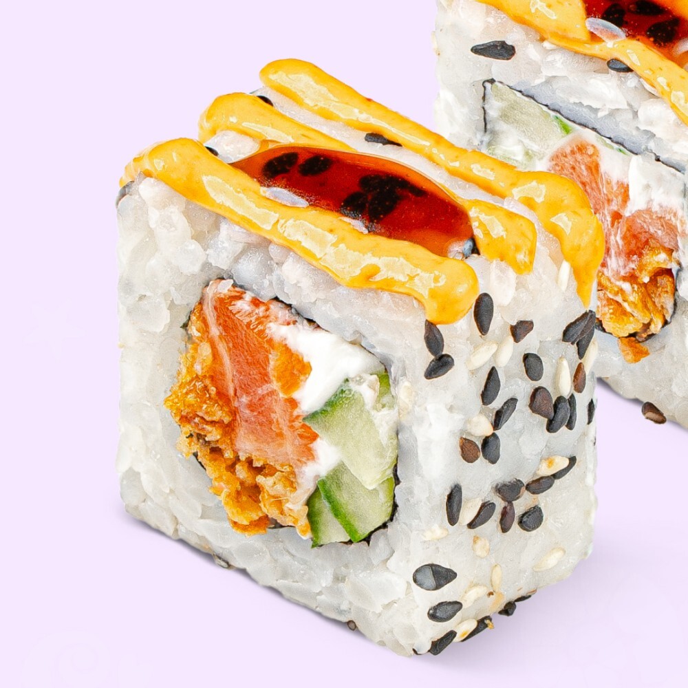 Кунжут белый, кунжут чёрный, нори, рис отварной, сыр сливочный, лосось, огурец, лук кранч, соус том ям, соус унаги
